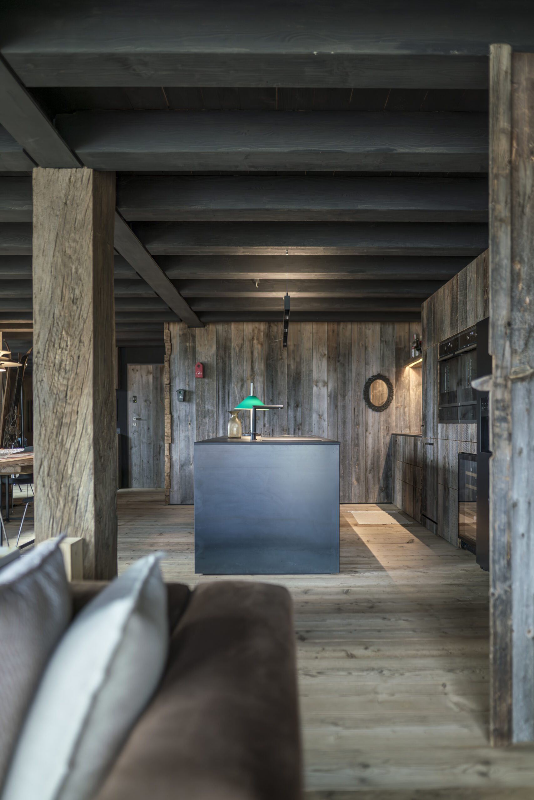 La panoramica zona giorno presenta un ampio salone principale da ricevimento con vetrate affacciate sulla vallata, accesso frontale al deck esterno e grande cucina a muro attrezzata con isola. I pavimenti in legno massello e i soffitti travati donano calore, mentre gli arredi su misura e le tonalità naturali creano un’atmosfera di raffinata semplicità perfetta per condividere momenti autentici.