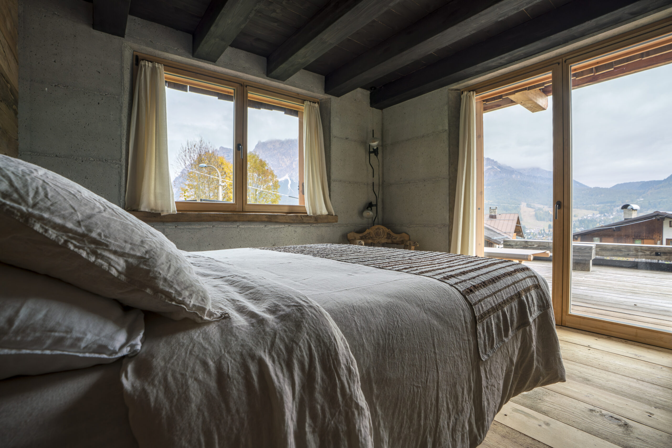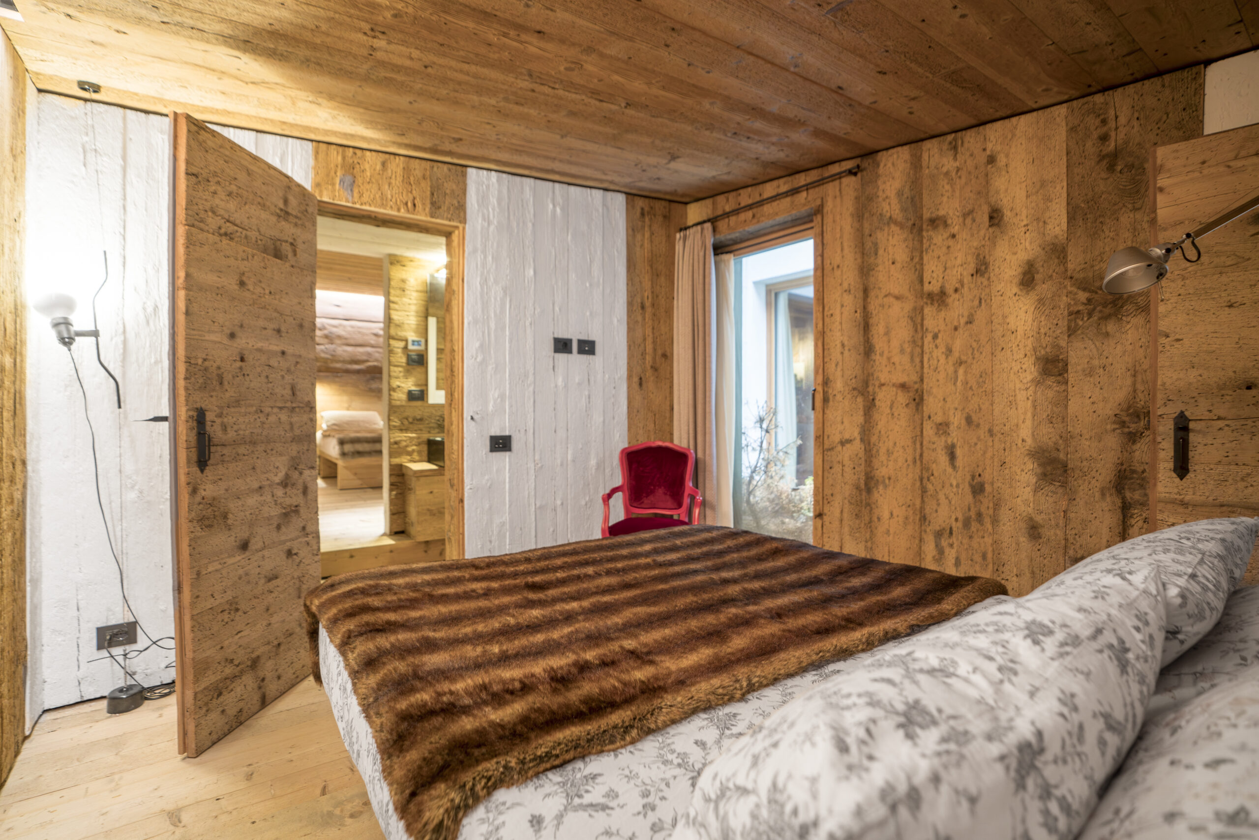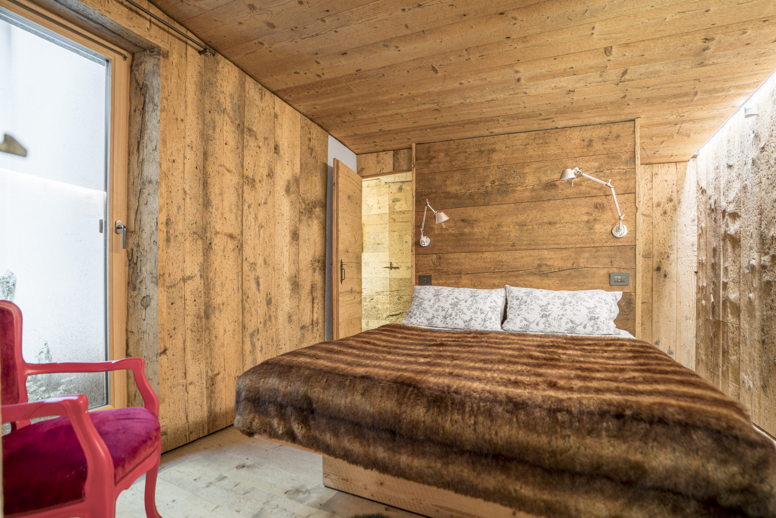 Gli ampi infissi incorniciano le montagne dando accesso all’area esterna e portando la natura dentro casa: il silenzio del legno e la luce soffusa accompagnano il riposo in un’atmosfera di quiete assoluta.