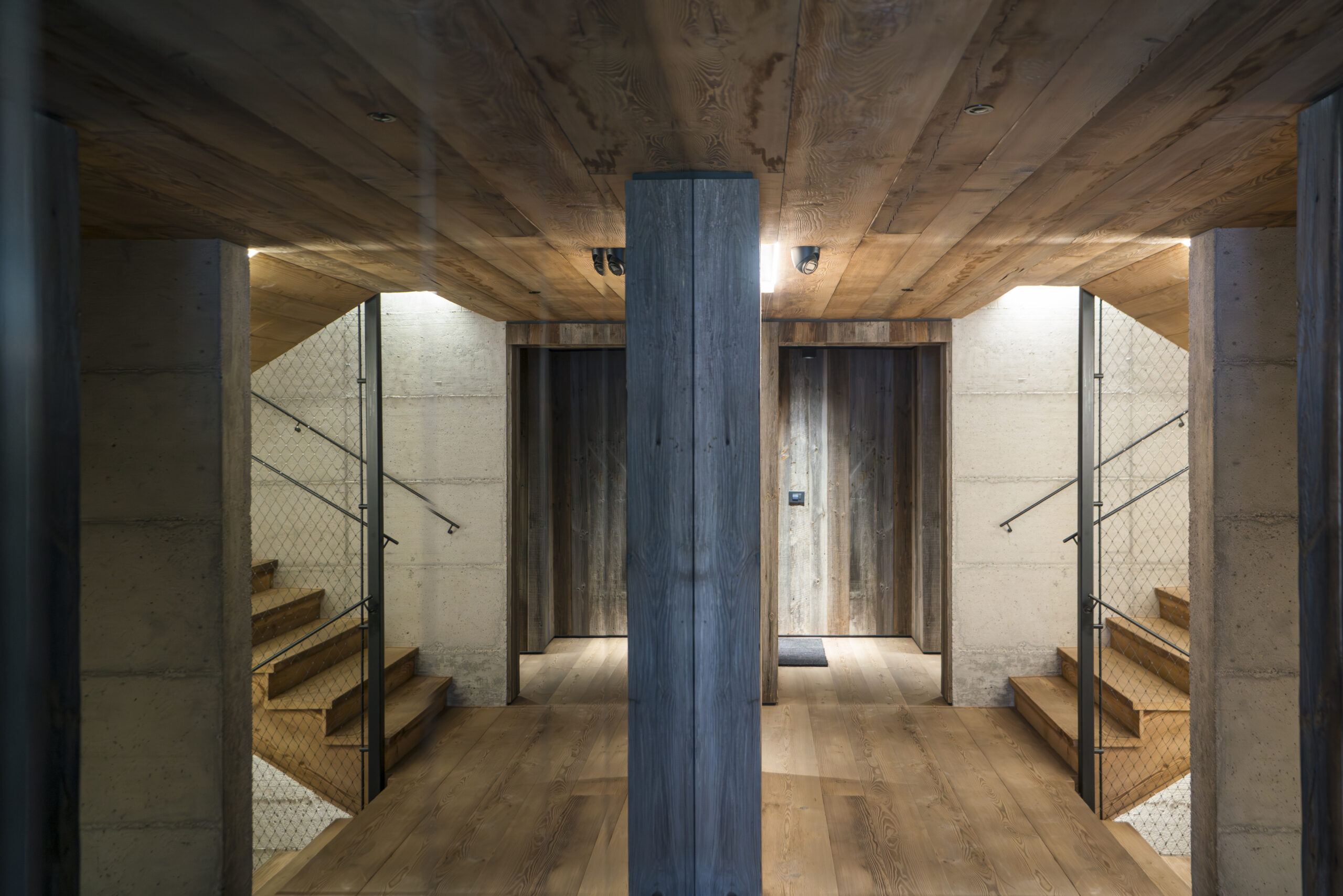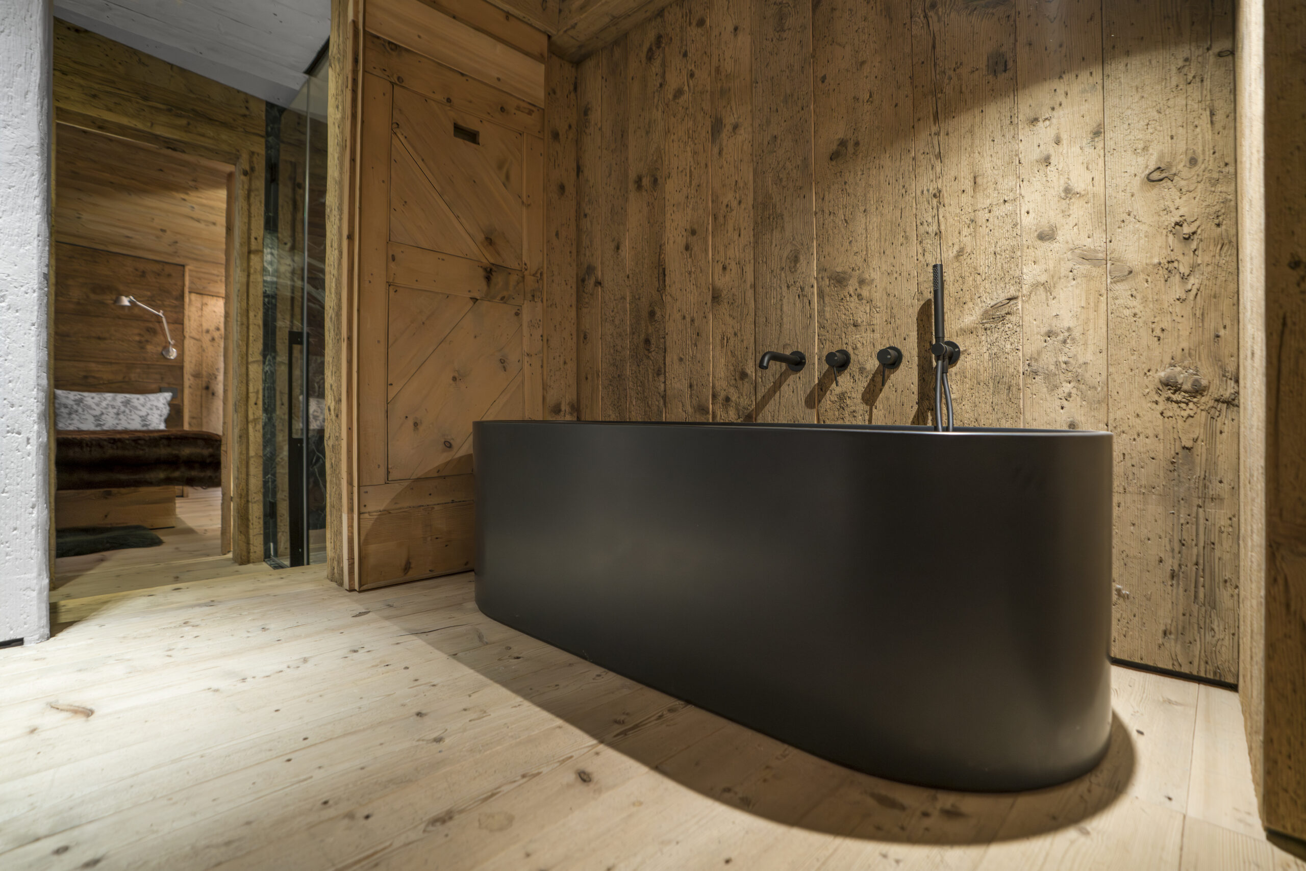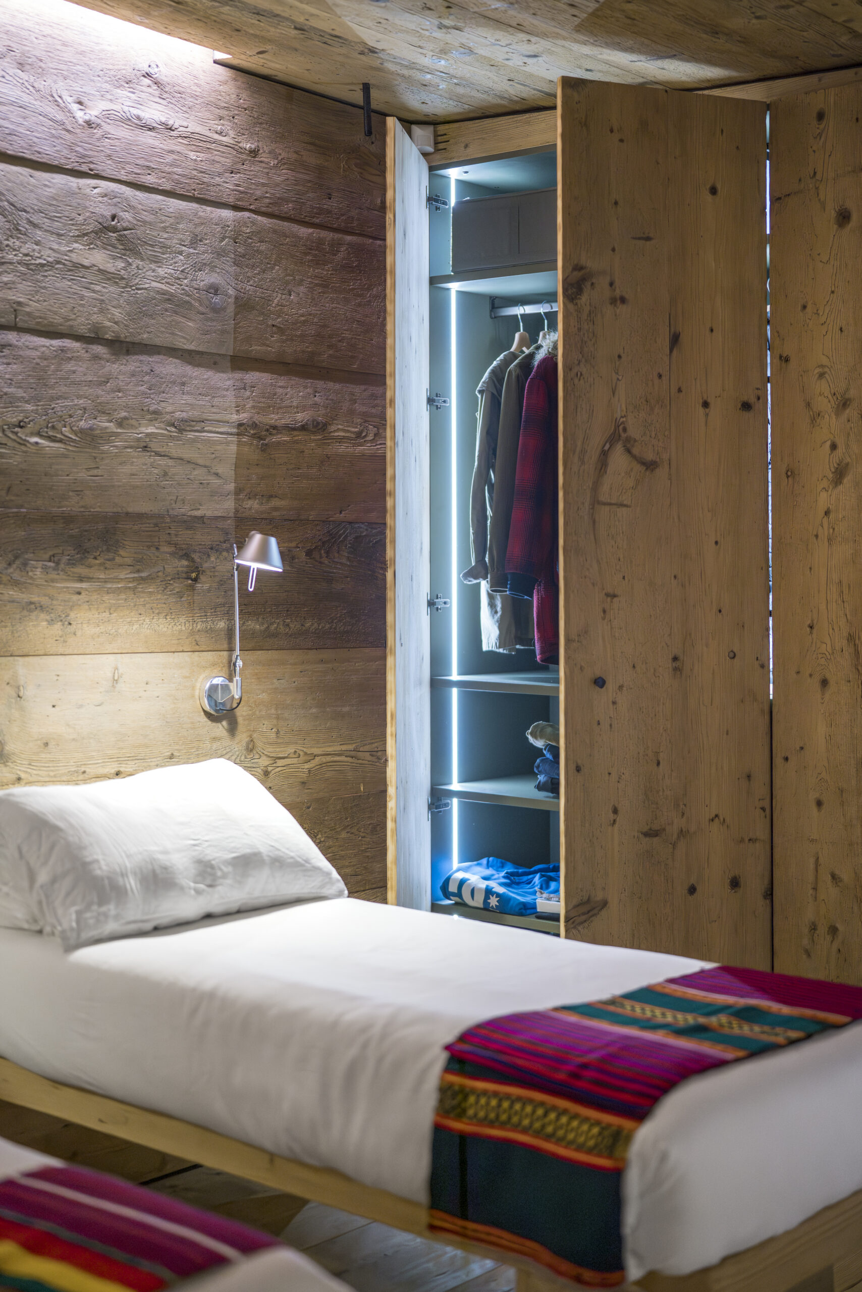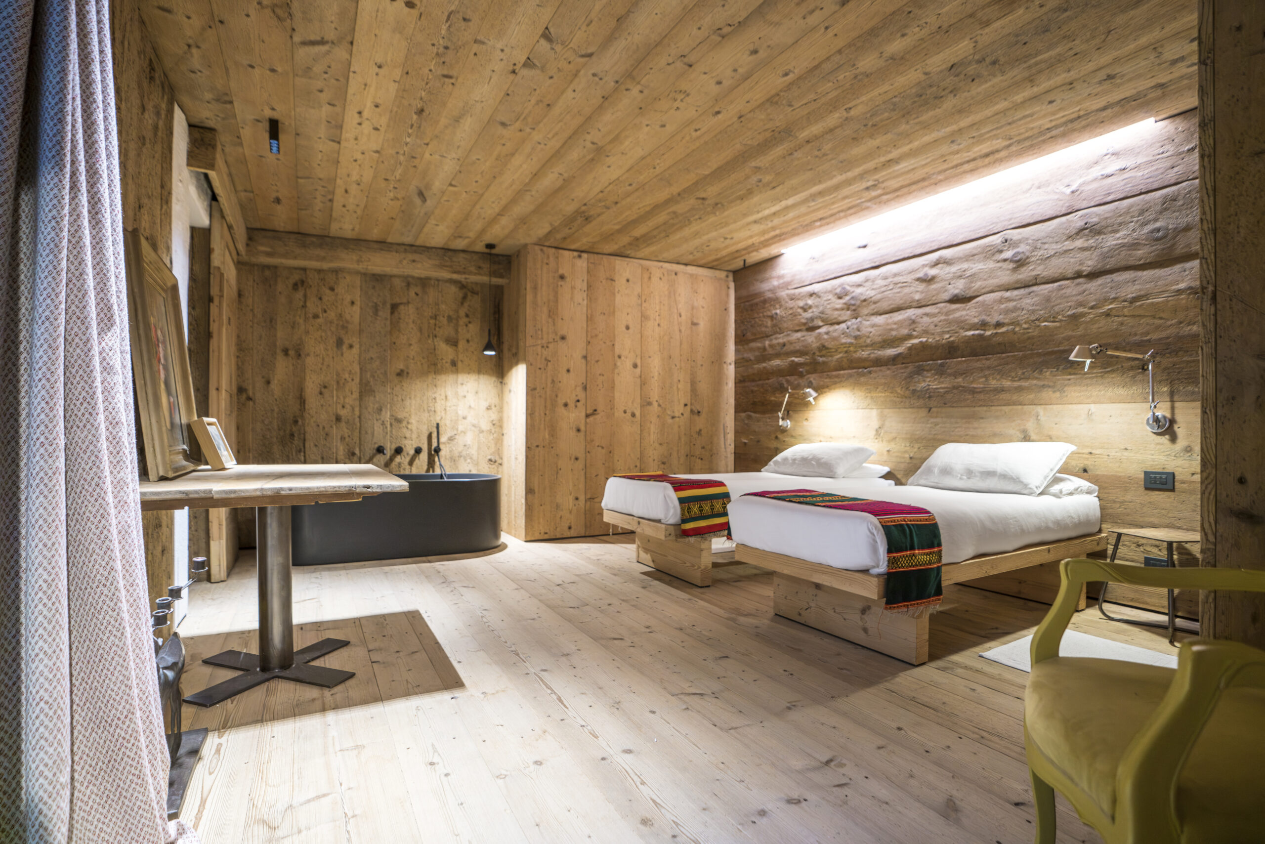 Gli ampi infissi incorniciano le montagne dando accesso all’area esterna e portando la natura dentro casa: il silenzio del legno e la luce soffusa accompagnano il riposo in un’atmosfera di quiete assoluta.