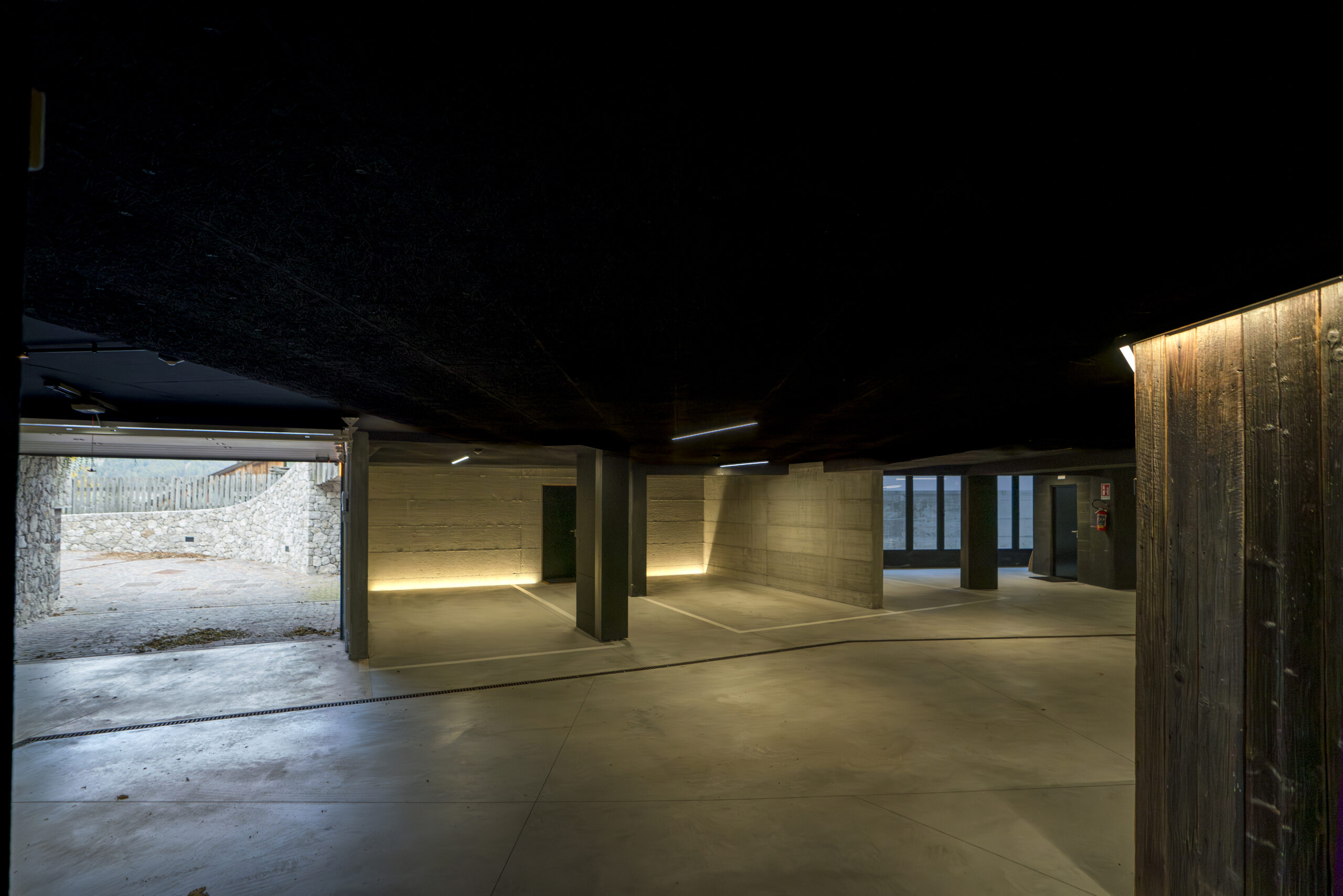 Un’illuminazione studiata con tagli di luce indiretta, valorizza la matericità delle superfici.